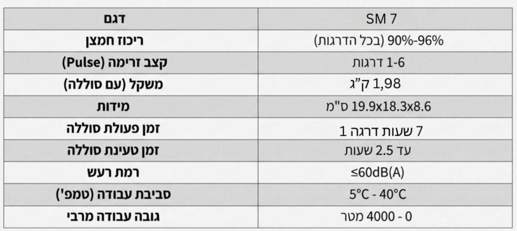 - SM7 עובד בטכנולוגיית Pulse Flow, כלומר הוא מספק חמצן בדיוק בזמן השאיפה. המערכת יעילה מאוד, שומרת על חיי הסוללה ומספקת ריכוז חמצן יציב של 90% עד 96%.
